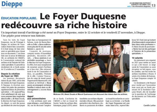 L’association Foyer Duquesne est créée à Dieppe le 3 juillet 1965 (JO du 17 juillet) en lien avec le service de prévention du CREAI de Haute-Normandie. Rapidement, une baraque est construite, avec les jeunes, sur la route de Bonne Nouvelle.